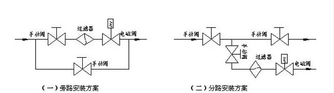 11、電磁閥的安裝位置應(yīng)預(yù)留一定操作空間,以便于日常保養(yǎng)和定期維護。 12、在管道鋼性不足或有水錘現(xiàn)象的情況下,建議把閥前后管子用支架或其它方式固定,以防電磁閥工作時引起振動。 13、在冰凍或嚴寒場所使用時,須用隔熱材料對管道和閥體加以保溫或在管道上設(shè)置加熱器。 14、電磁閥與管道接好后,要進行正向打壓(切勿反向打壓,否則會損壞電磁閥),檢查電磁閥及接管處是否有泄漏。 15、對于配有標準接線盒的電磁閥,應(yīng)將塑料接線盒拆下打開將出廠時測試電源線去掉后將用戶電源線連接到端子上固定,而對于導(dǎo)線或引線式的電磁閥則不能去除,直接將導(dǎo)線與用戶電源線連接。 16、與電磁閥相關(guān)的電源控制線路及設(shè)施,如繼電器、開關(guān)和接觸器等應(yīng)連接牢固、不得有松動或振動,電氣回路要接入相應(yīng)的保險線,作為電氣回路的保護,否則將影響電磁閥的正常工作或損壞。 17、為便于正常維護或預(yù)防電磁閥發(fā)生故障時維修更換,并保證系統(tǒng)正常運行,建議采取以下其中之一備用管路方案: