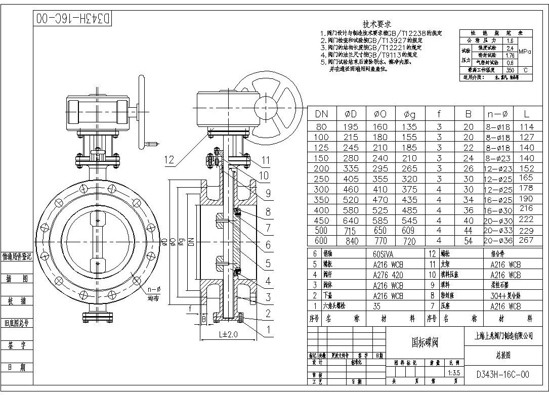 三、D343H 多層次硬密封蝶閥--主要連接及外形尺寸 公稱通徑 DN | 結構長度L | 外形尺寸(參考值) | 連接(標準值) | 參考 重量Dt343H | | H | Dt343H | PN0.6MPa | PN1.0MPa | | mm | inch | 短 | 長 | H1 | A1 | B1 | D | D1 | z-d | D | D1 | z-d | | 50 | 2 | 108 | 150 | 112 | 350 | 180 | 200 | 140 | 110 | 4-14 | 165 | 125 | 4-18 | 17 | | 65 | 5/2 | 112 | 170 | 115 | 370 | 180 | 200 | 160 | 130 | 4-14 | 185 | 145 | 4-18 | 20 | | 80 | 3 | 114 | 180 | 120 | 380 | 180 | 200 | 190 | 150 | 4-18 | 200 | 160 | 8-18 | 23 | | 100 | 4 | 127 | 190 | 138 | 420 | 180 | 200 | 210 | 170 | 4-18 | 220 | 180 | 8-18 | 25 | | 125 | 5 | 140 | 200 | 164 | 460 | 180 | 200 | 240 | 200 | 8-18 | 250 | 210 | 8-18 | 40 | | 150 | 6 | 140 | 210 | 175 | 555 | 270 | 280 | 165 | 225 | 8-18 | 285 | 240 | 8-22 | 47 | | 200 | 8 | 152 | 230 | 208 | 605 | 270 | 280 | 320 | 280 | 8-18 | 340 | 295 | 8-22 | 60 | | 250 | 10 | 165 | 250 | 243 | 680 | 270 | 280 | 375 | 335 | 12-18 | 395 | 350 | 12-22 | 95 | | 300 | 12 | 178 | 270 | 283 | 800 | 380 | 420 | 440 | 395 | 12-22 | 445 | 400 | 12-22 | 124 | | 350 | 14 | 190 | 290 | 310 | 835 | 380 | 420 | 490 | 445 | 12-22 | 505 | 460 | 16-22 | 181 | | 400 | 16 | 216 | 310 | 340 | 915 | 450 | 470 | 540 | 495 | 16-22 | 565 | 515 | 16-26 | 260 | | 450 | 18 | 222 | 330 | 380 | 960 | 480 | 490 | 595 | 550 | 16-22 | 615 | 565 | 20-26 | 338 | | 500 | 20 | 229 | 350 | 410 | 1020 | 480 | 490 | 645 | 600 | 20-22 | 670 | 620 | 20-26 | 360 | | 600 | 24 | 267 | 390 | 470 | 1225 | 480 | 660 | 755 | 705 | 20-26 | 780 | 725 | 20-30 | 540 | | 700 | 28 | 292 | 430 | 550 | 1355 | 640 | 660 | 860 | 810 | 24-26 | 895 | 840 | 24-30 | 580 | | 800 | 32 | 318 | 470 | 640 | 1470 | 640 | 660 | 975 | 920 | 24-30 | 1015 | 950 | 24-33 | 845 | | 900 | 36 | 330 | 510 | 710 | 1545 | 750 | 860 | 1075 | 1020 | 24-30 | 1115 | 1050 | 28-33 | 1050 | | 1000 | 40 | 410 | 550 | 770 | 1795 | 850 | 860 | 1175 | 1120 | 28-30 | 1230 | 1160 | 28-36 | 1500 | | 1200 | 48 | 470 | 630 | 890 | 1965 | 850 | 900 | 1405 | 1340 | 32-33 | 1455 | 1380 | 32-39 | 2000 |