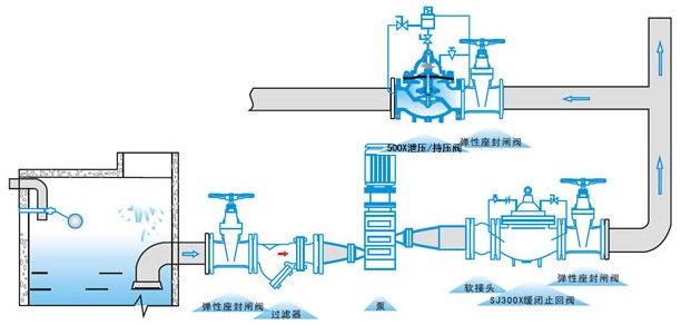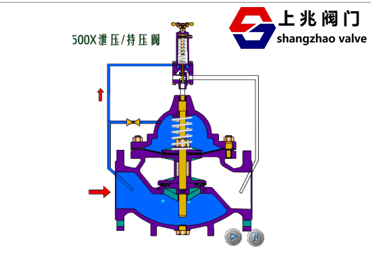 500X泄壓閥/持壓閥由主閥、泄壓/持壓導閥針閥、球閥、微形過濾器和壓力表組成水力控制接管系統(tǒng)。利用水力自動操作,即可以作泄壓閥用又可作持壓閥用。作泄壓閥用時,可維持供水路壓力在設(shè)定的安全值之下;做持壓閥用,可維持主閥上游水壓在設(shè)定值之上,保持主閥上游供水壓力。 二、500X泄壓閥/持壓閥--工作原理