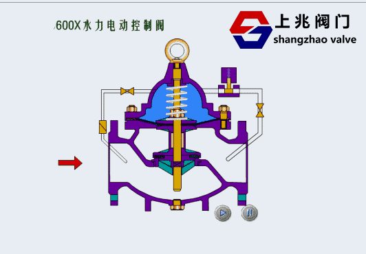 600X水力電動控制閥由主閥、電磁導閥、針閥、球閥、微形過濾器和壓力表組成水力控制接管系統。通過電磁導閥可以實現對閥門開啟和關閉的遙控。加裝附加裝置后,可控制開啟和關閉的速度。本產品利用導閥控制閥門的開啟和關閉,節省能源。可代替其它閥門大型電動裝置。 二、600X水力電動控制閥--工作原理