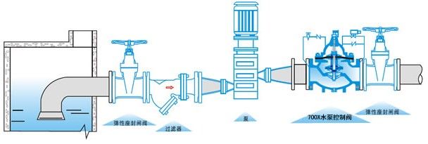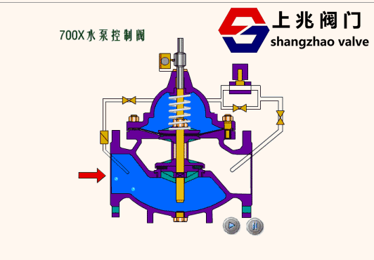 700X多功能水泵控制閥由主閥、電磁導閥、針閥、球閥、單向閥、行程開關、微形過濾器和壓力表組成水力控制接管系統。水泵需停止工作時,先由進口壓使主閥關閉90%后,水泵停止運轉。剩余10%由回水關閉。可防止水錘現象發生。本產品利用電磁導閥控制,不需要其它裝置和能源。節約能源,保養簡便,停泵平穩。電磁閥可采用交流電220V或直流電24V。 二、700X多功能水泵控制閥--工作原理