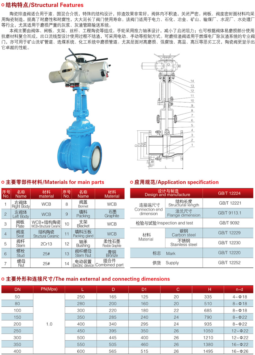 產(chǎn)品介紹 PZ941TC電動(dòng)耐磨陶瓷排渣閥產(chǎn)品概述: PZ941TC 電動(dòng)耐磨陶瓷排渣閥適用于公稱壓力P N 1.6~6.4Mpa,工作溫度0~100℃的火力電站水利排渣系統(tǒng)及水利工程的灰漿排放系統(tǒng)管路上,切斷或接通管路中聽介質(zhì),適用介質(zhì)為:灰水混合物,渣水混合物。 PZ941TC電動(dòng)耐磨陶瓷排渣閥優(yōu)點(diǎn): PZ941TC 電動(dòng)耐磨陶瓷排渣閥主要應(yīng)用于電力、石油、化工、冶金、采礦、污水處理等工業(yè)領(lǐng)域,尤其是面對(duì)高磨損、強(qiáng)腐蝕、高溫、高壓等惡劣工況,陶瓷閥更顯示出它卓越的性能。 PZ941TC 電動(dòng)耐磨陶瓷排渣閥能滿足高磨損、強(qiáng)腐蝕的使用環(huán)境,尤其突出的特點(diǎn)是超長(zhǎng)的使用壽命,陶瓷閥門的性能價(jià)格比遠(yuǎn)遠(yuǎn)優(yōu)于其它同類金屬閥門。 PZ941TC電動(dòng)耐磨陶瓷排渣閥結(jié)構(gòu)優(yōu)勢(shì)與特點(diǎn): 1、 采用中法蘭螺栓連接,支管兩端為法蘭連接結(jié)構(gòu)。 2、 啟閉件采用半密封副強(qiáng)制密封,性能優(yōu)良。 3、 密封副材料為耐磨合金,耐磨性強(qiáng)、耐沖蝕、耐擦傷、摩擦力小、密封可靠。 4、 閥體出流道線型合理,不存渣,啟閉靈活,不卡阻。 5、 閥桿表面經(jīng)調(diào)質(zhì)及氮化處理,有良好的抗腐蝕性,抗擦傷和耐磨性。 6、 中大口徑設(shè)置滾動(dòng)軸承,啟閉輕松。 PZ941TC電動(dòng)耐磨陶瓷排渣閥試驗(yàn)壓力: